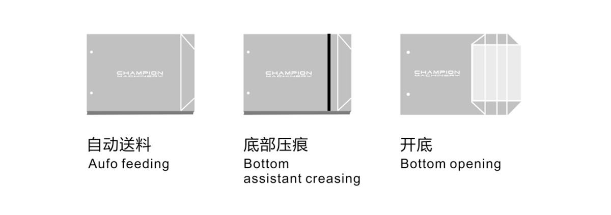 該方案是以單張紙和底卡為原料,由飛達(dá)進(jìn)行全自動(dòng)送紙,經(jīng)由輸紙平臺(tái)進(jìn)行輸送,然后用前規(guī)、側(cè)規(guī)進(jìn)行單張準(zhǔn)確定位,送入壓線(xiàn)部壓豎線(xiàn)。自動(dòng)涂膠(可同時(shí)噴熱熔膠),成型,自動(dòng)折風(fēng)琴,自動(dòng)壓筒,再經(jīng)由推規(guī)定位,送入壓橫線(xiàn)裝置壓橫線(xiàn),再進(jìn)入拉底,上底膠,底部成型,一次完成。本機(jī)采用觸摸屏控制,制袋精度髙,速度快,是加工出口型手提袋,髙檔奢侈品手提袋的理想全自動(dòng)設(shè)備。